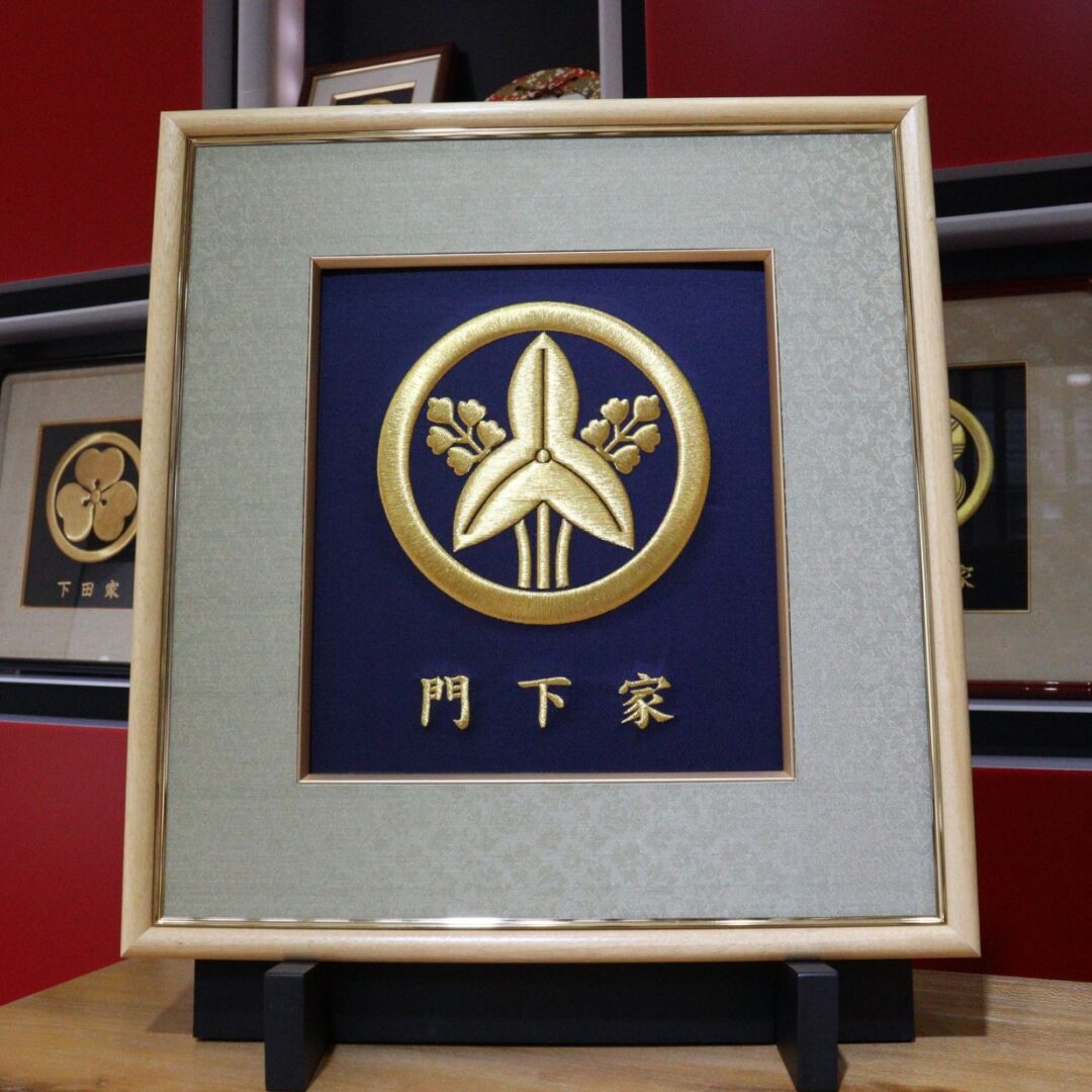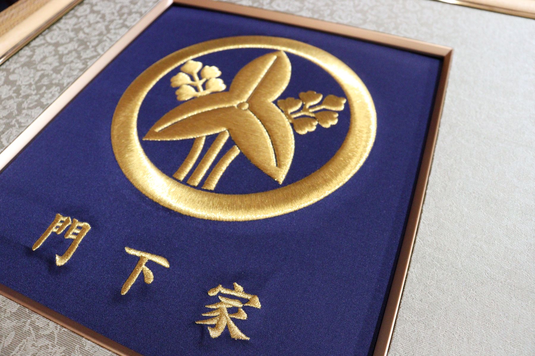 土台には落ち着いた西陣織の濃紺を使い、その上に本金糸で家紋を丁寧に刺繍しました。刺繍サイズは17cmと大きくしっかりとした存在感があります。