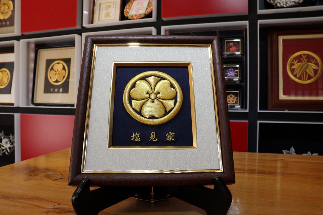 ご家族の歴史と想いを大切に金糸で「丸に剣片喰」の家紋を丁寧に刺繍しました。 西陣織の濃紺地にしっとりと馴染む金糸の輝きはその美しさを最大限に引き出されています。 家紋はご家族の絆を未来へ繋ぐ大切な宝物となります。