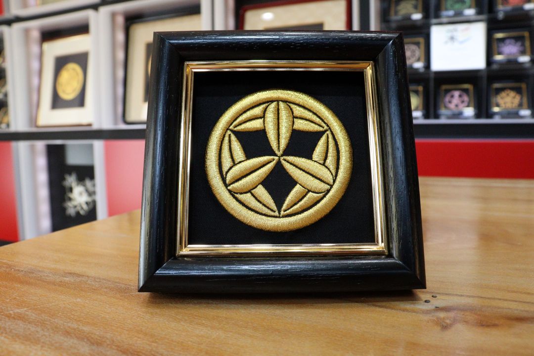 西陣織の持つ深みのある黒地に上質な金糸で家紋「丸に九枚笹」を刺繍。金糸の持つ光沢と西陣織の微細な織り柄が相乗効果を生み出し家紋の持つ格式と美しさを一層際立たせています。