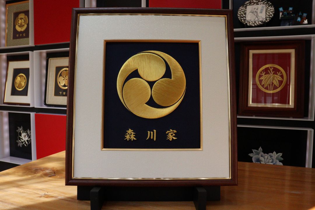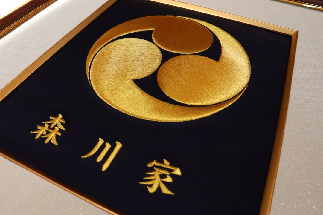 この家紋額は、「左三つ巴」で生地には深みのある西陣織の濃紺を使用しております。家紋は金糸でサイズ17cmの存在感ある大きさで丁寧に刺繍しました。家名は、楷書体で配置されています。