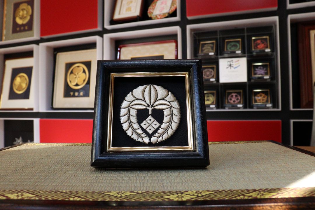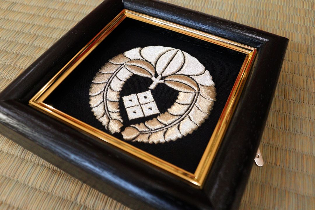 彩華額は手のひらサイズの家紋額です。日常のインテリアとして飾りやすくご紹介の額は刺繍部分の家紋サイズが7センチ