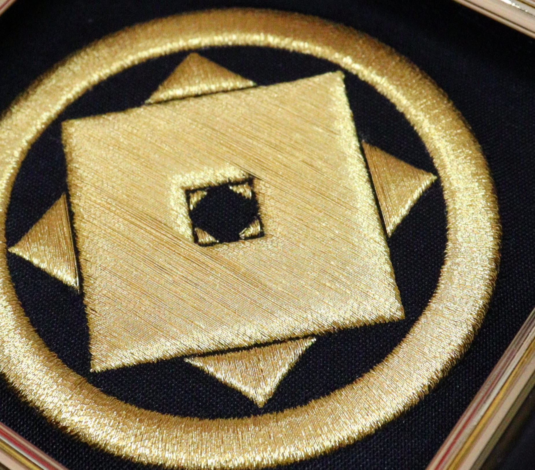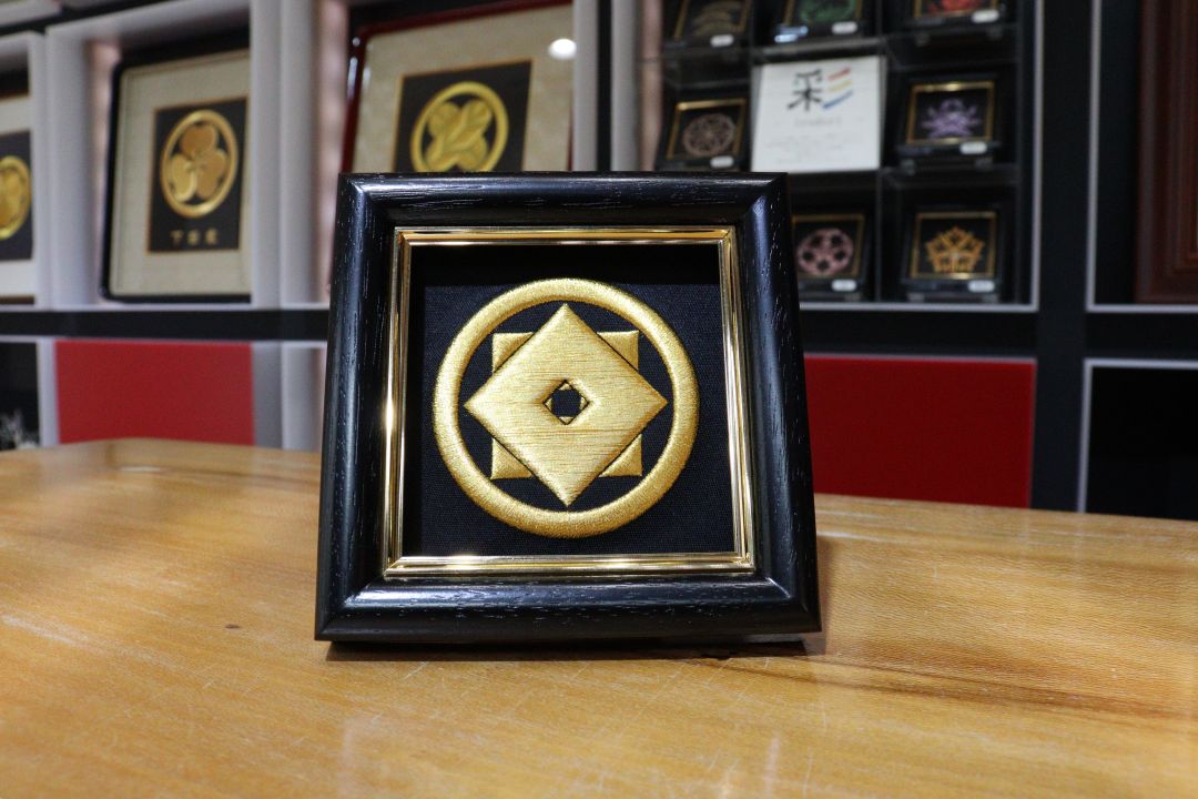 黒の西陣織を背景に金糸で家紋を刺繍しました。 7センチという緻密なサイズの中に紋の持つ洗練された様式美を凝縮しています。 西陣織の重厚な質感と金糸のコントラストが、凛とした格調高い佇まいを見せる一品です。