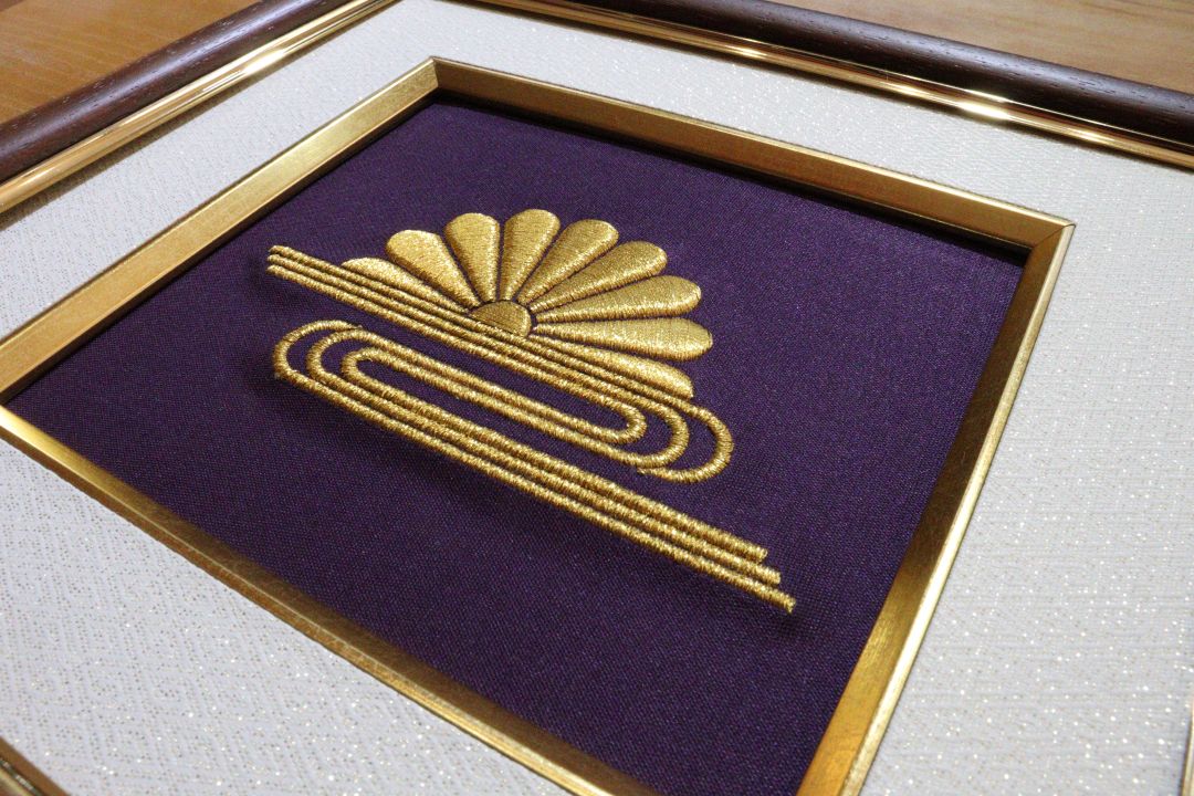 深みのある紫の西陣織に9センチの本金糸刺繍を施しました。 横置きの構図の中で、緻密に刺し込まれた本金糸の家紋が確かな存在感を放ちます。